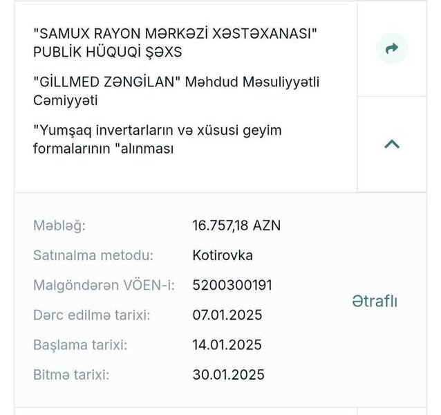 Samux rayon Mərkəzi Xəstəxanasının 145 min manatlıq tenderinin adı var özü yoxdur.