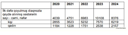 Səhiyyə Nazirliyinin məlumatlarına əsasən, 2024-cü ildə psixi və davranış pozuntuları olan xəstələrin (psixoaktiv maddələrin qəbulu ilə bağlı pozuntular istisna olmaqla) sayı 8 376 nəfər olub.