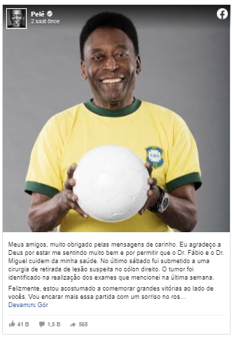 Ötən həftə müayinə üçün San-Paulu xəstəxanasına gedən "futbol kralı"nın yoğun bağırsağında şiş aşkar olunub.