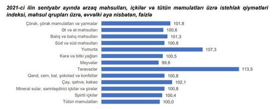 2021-ci ilin sentyabr ayında ərzaq məhsulları, içkilər və tütün məmulatları üzrə istehlak qiymətləri indeksi əvvəlki aya nisbətən 102,6 faiz, əvvəlki ilin sentyabr ayına nisbətən 110,4 faiz təşkil edib.