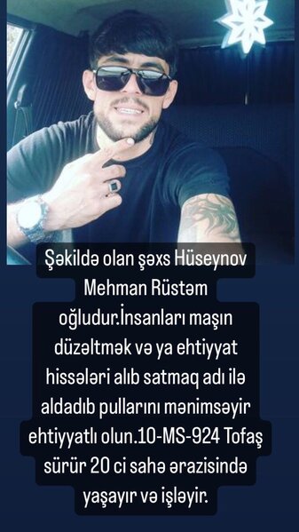 Bakıda qəribə oğurluq hadisəsi baş verib. Paytaxt sakini Kənan İsmayıl avtomobili xarab olduğu üçün yolda ona yaxınlaşan şəxsdən kömək istəyib. Həmin şəxsin Hüseynov Mehman olduğu müəyyənləşib. Mehman adında şəxs ona avtomobil ehtiyat hissələri satdığını bildirərək, ondan pul istəyib. Vətəndaş aldadıldığını başa düşən zaman polisə müraciət edib. Məlum olub ki, həmin şəxs bir neçə vətəndaşı bu üsulla aldadıb. Həmin şəxsi tanıyan və görənlərdən 102 xidməti və ya 099-310-10-29 nömrəsi ilə əlaqə saxlamaqları xahiş olunur.