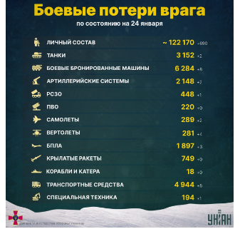 Döyüşlər nəticəsində Rusiyanın 122 170 hərbçisi zərərsizləşdirilib.