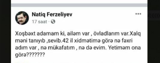 BAKU.WS xəbər verir ki, o, fesybuk səhifəsində paylaşım edərək 42 illik sənət fəaliyyəti olduğunu, lakin hələ də heç bir Fəxri ada layiq görülmədiyini vurğulayıb: