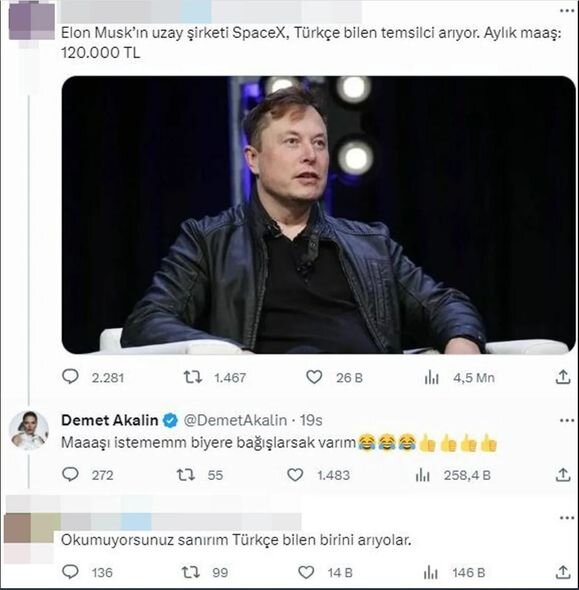 Məşhur türkiyəli sənətçi Demet Akalın İlon Maskın şirkətinin elan etdiyi vakansiya üçün namizədliyini irəli sürüb.