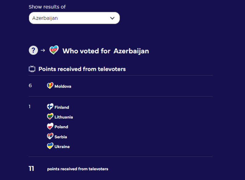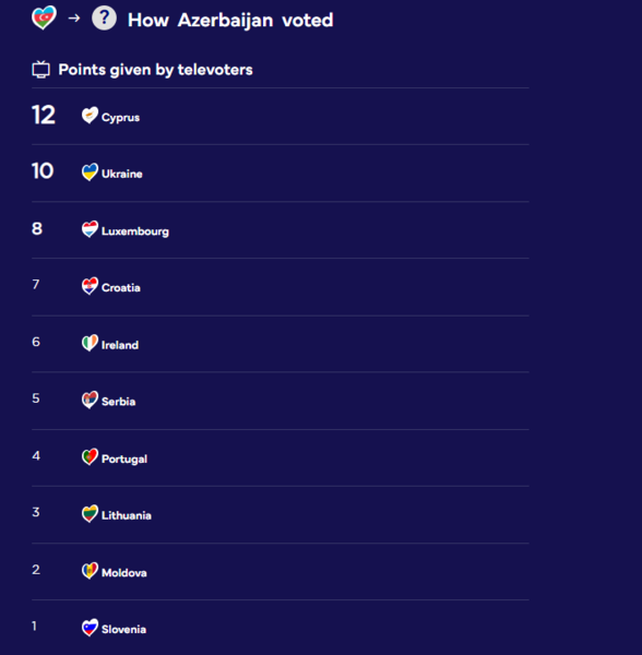 Bundan başqa, Azərbaycan tamaşaçısının hansı ölkələrə səs verdiyi açıqlanıb: Kipr (12 bal), Ukrayna (10 bal), Lüksemburq (8 bal), Xorvatiya (7 bal), İrlandiya (6 bal), Serbiya (5 bal), Portuqaliya (4 bal), Litva (3 bal), Moldova (2 bal), Sloveniya (1 bal).