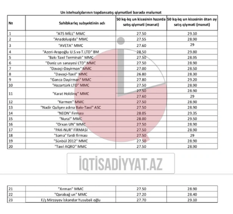 Açıqlanan rəsmi məlumatda ölkədə hazırda 50 kq-lıq unun topdansatış qiyməti 26,8-28,5 manat aralığında dəyişir. Ötən ay bu rəqəm 28,3-29,5 manat təşkil edirdi. Ən ucuz un növü "Dəvəçi-Taxıl" MMC, ən bahalısı isə "Azeri-Arapoğlu U.S. və T.LTD" BM tərəfindən bazara təqdim olunur.