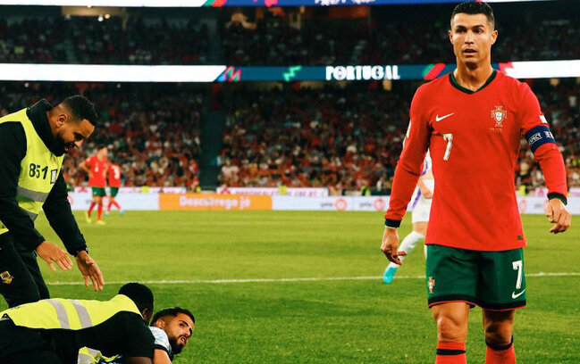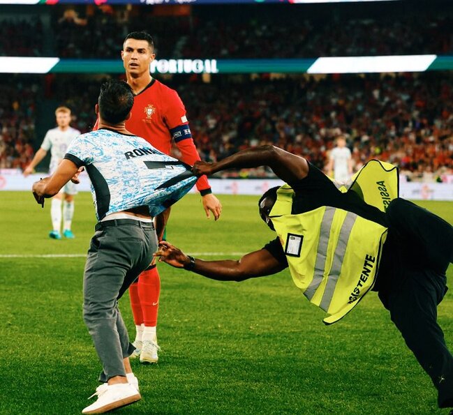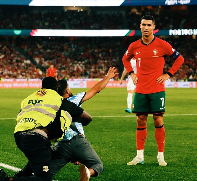 "Qafqazinfo" xəbər verir ki, ötən gün Portuqaliya millisinin Şotlandiya ilə matçından sonra azarkeşlərdən biri ulduz futbolçu ilə görüşmək üçün meydançaya girib.