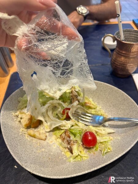 Gətirdikləri sezar salatından bir az yedikdən sonra bıçaqla bölməyə çalışdığımız qidanın mayonezli kələm yox, salatın içinə qarışıb ərimiş böyük bir sellofan olduğunu gördük. Yeməkdən tük çıxmağını başa düşərəm, amma daha "çanta" çıxmasın da…