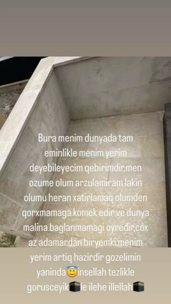 Sonxeber.az olay-a istinadən xəbər verir ki, o, aktrisanın instaqramında şəkil paylaşıb və bildirib ki, özünə qəbir yeri ayırıb.