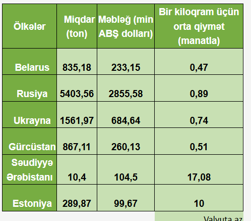 Valyuta.az rəsmi məlumatlara istinadən xəbər verir ki, bu miqdarda məhsul ixracından əldə olunan gəlirin həcmi 4 milyon 237 min 670 ABŞ dolları təşkil edib.