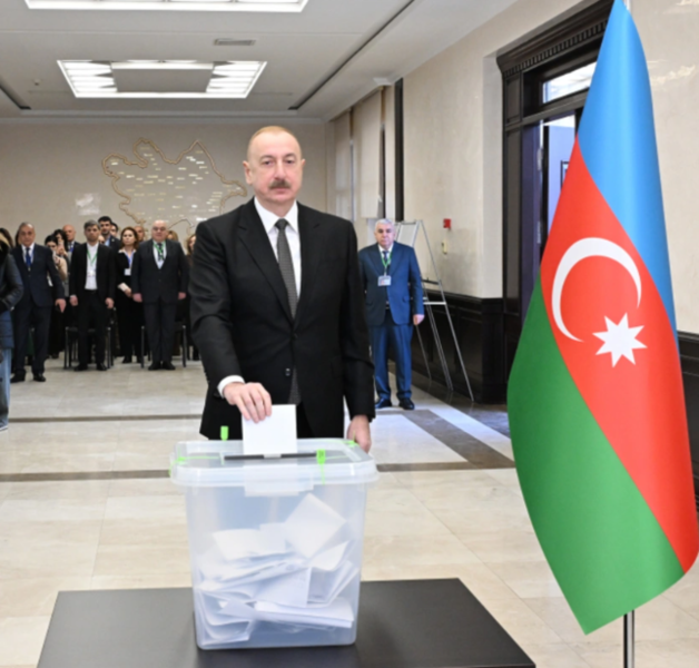 Prezident İlham Əliyev səsvermə otağına daxil olub seçki bülletenini alaraq kabinəyə keçib və sonra bülleteni qutuya salıb.