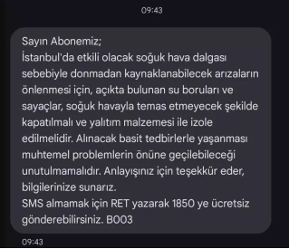 "İstanbulda təsirli olacaq soyuq hava dalğaları səbəbiylə donma nəticəsində yarana biləcək nasazlıqların qarşısını almaq üçün açıq havada yerləşən su boruları və sayğaclar soyuq hava ilə təmasda olmayacaq şəkildə örtülməli və izolyasiya edilməlidir. İzolyasiya materialı ilə mümkün problemlərin qarşısını sadə tədbirlərlə almaq olar".