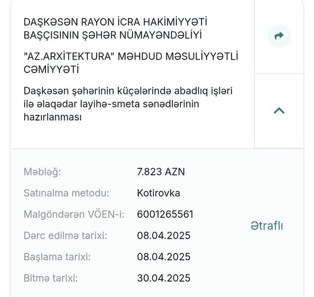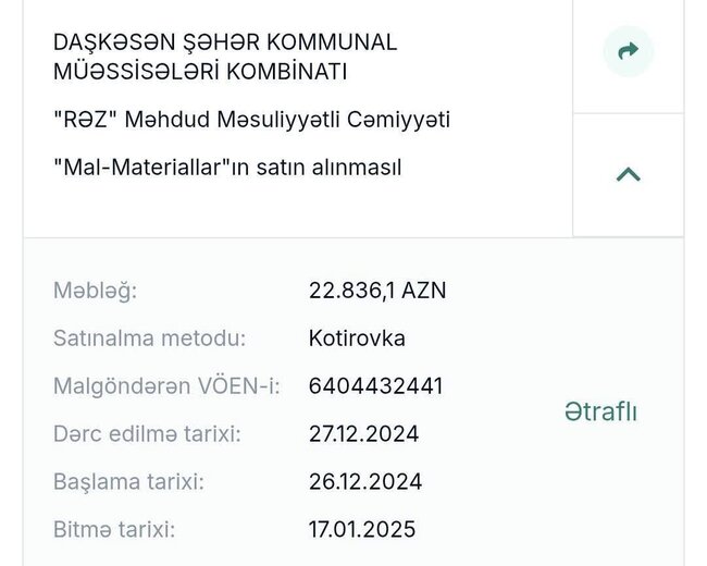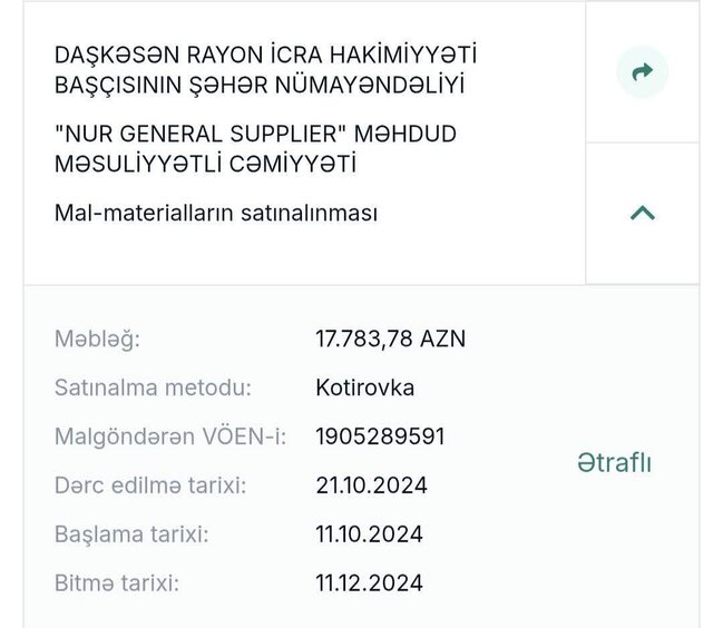 Maraqlıdır ki, parallel olaraq Daşkəsən İcra Hakimiyyətə "Rəz" MMC ilə də mal və materialların alınmasına dair anlaşıb. 22 min 831 manatlıq satınalma müqaviləsi bağlanılıb.
