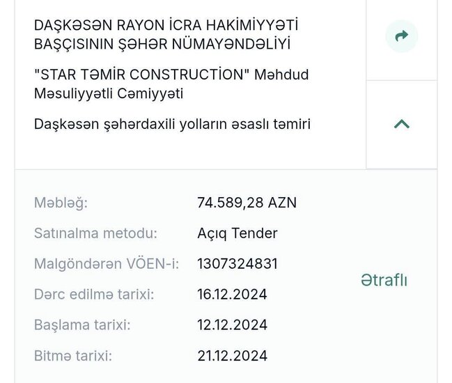 Həmin şirkətlə ötən ilin dekabrında Daşkəsəndə yolların əsaslı təmiri üçün də iki müqavilə bağlanılıb. Birinci tender üzrə şirkətə 85 min 819 manat, ikinci tender üzər isə 74589 manat pul ayrılıb.