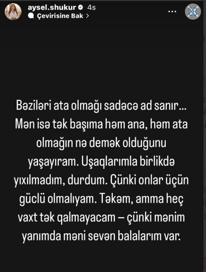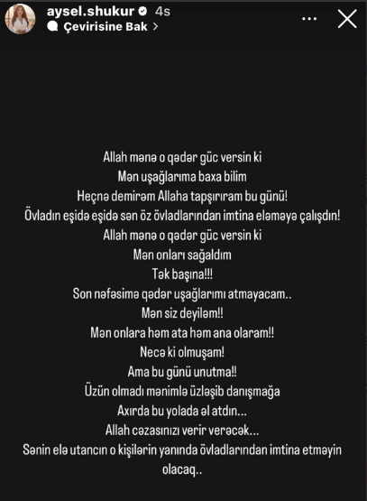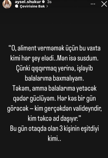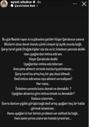 "Bu gün Nəsimi Rayon İcra Şöbəsinə, Vüqar Qaralovun yanına getdim. Əkizlərin atası dəvət olundu, çünki onunla bağlı cinayət işi açılıb. Otaqda kişilər ola-ola və öz övladının yanında dedi ki, uşaqlardan imtina edirəm. Vüqar Qaralov isə bildirdi ki, imtina edə bilərsən, amma aliment vermək məcburiyyətindəsən. Qarşı tərəf isə artıq heç bir şey deyə bilmədi. Dedi, imtina edirəmsə, niyə aliment verməliyəm?", - deyə Aysel Şükürova paylaşımda qeyd edib.