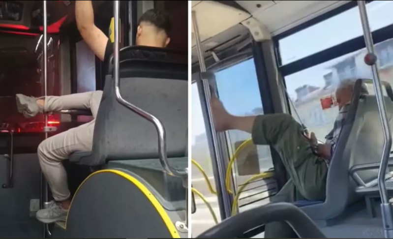 Sonxeber.az xəbər verir ki, görüntülərdə bir sərnişinin ayaqqabısın geyinmiş halda qarşısındakı tutacağa ayağını dayadığı, digər sərnişinin isə çılpaq ayağını pəncərə yanında yerləşən tutacağa uzatdığı görünür.
