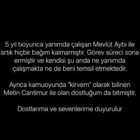 "5 il boyunca yanımda çalışan Mevlüt Aybı ilə artıq heç bir bağım qalmamışdır. Onunla əməkdaşlığım sona çatmışdır və hazırda nə yanımda işləyir, nə də məni təmsil edir. Həmçinin, ictimaiyyətdə "kirvəm" olaraq bilinən Metin Cantimur ilə olan dostluğum da bitmişdir".